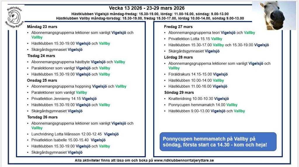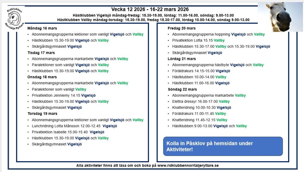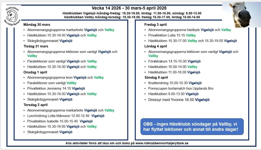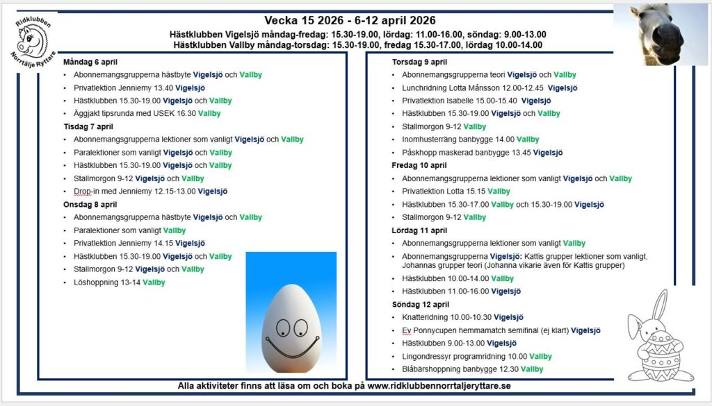 Vad händer vecka 15 2026? Lektioner som vanligt för abonnemangsgrupperna, och lite extra påsklovsaktiviteter 🙂 Läs mer » 2026-04-06