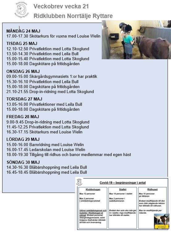 Efter ridskoleterminens slut, och innan ridlägren börjar, har vi en aktivitetsvecka vecka 23! Många roliga aktiviteter att anmäla sig till – blåbärshoppning, WE, privatlektioner! Här